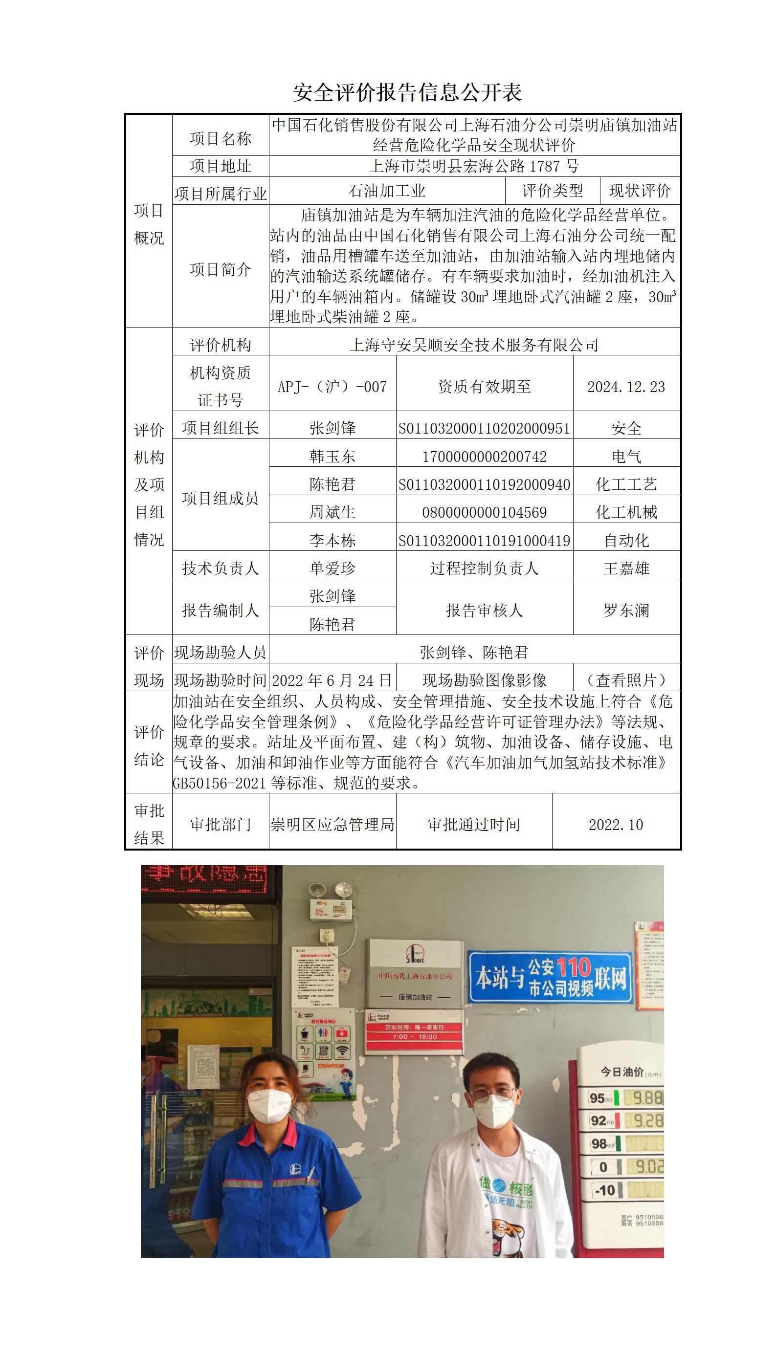 中国石化销售股份有限公司上海石油分公司崇明庙镇加油站经营危险化学品安全现状评价