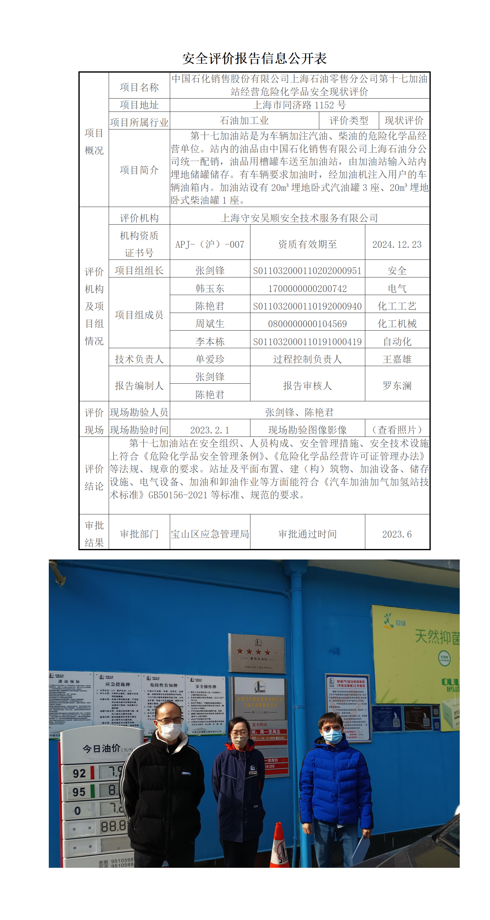 中国石化销售股份有限公司上海石油零售分公司第十七加油站经营危险化学品安全现状评价