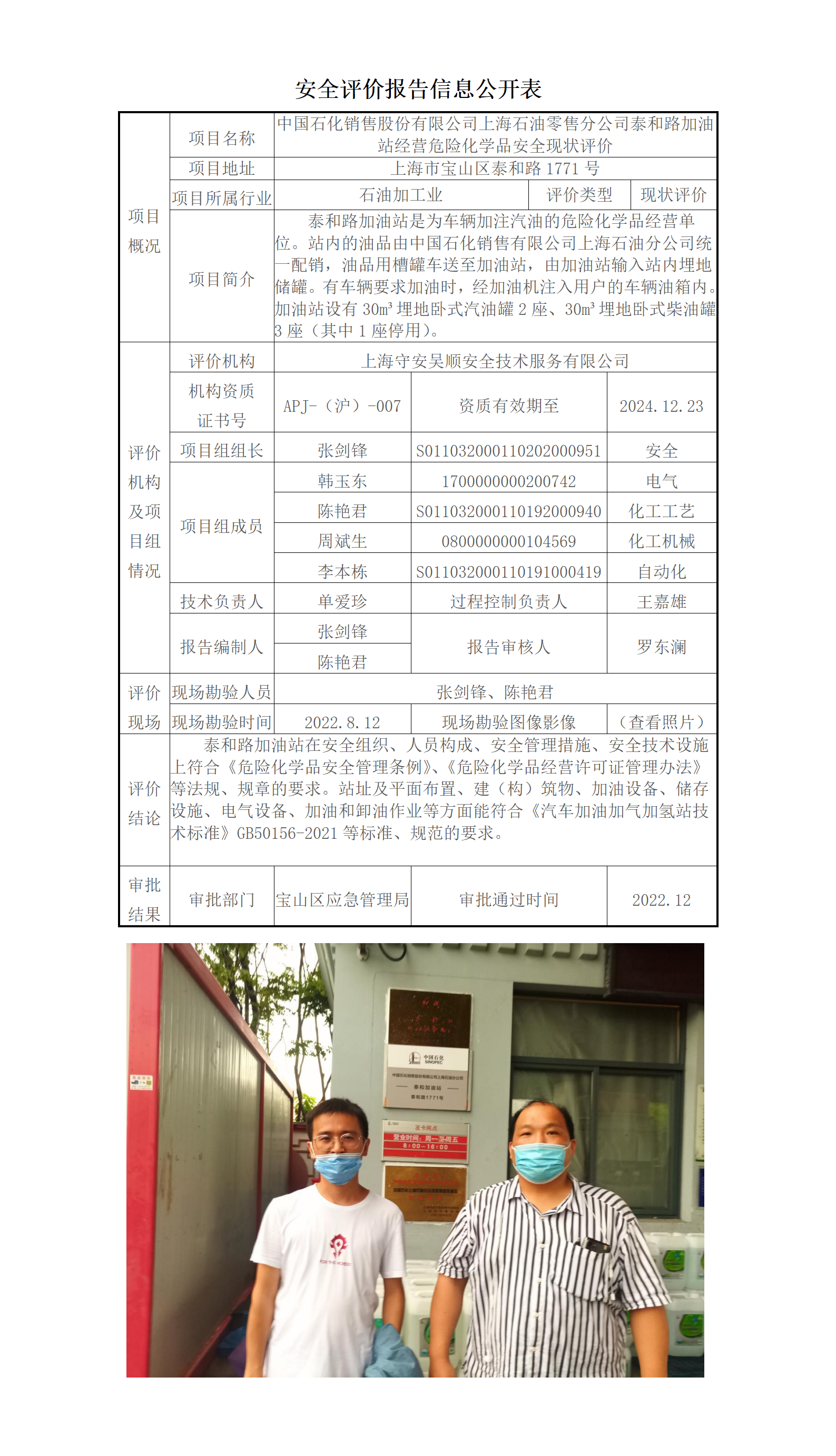 中国石化销售股份有限公司上海石油零售分公司泰和路加油站经营危险化学品安全现状评价