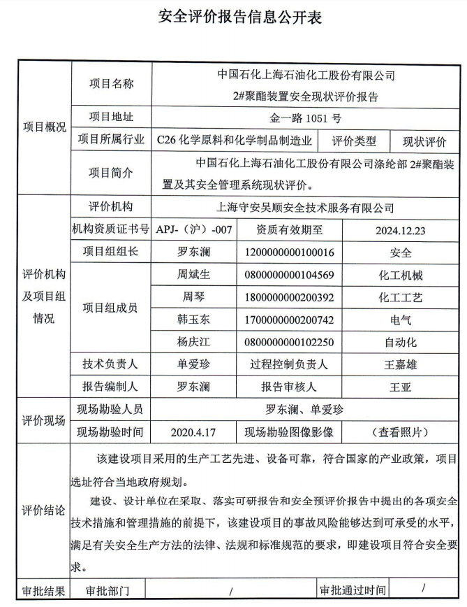 中国石化上海石油化工股份有限公司 2#聚酯装置安全现状评价报告
