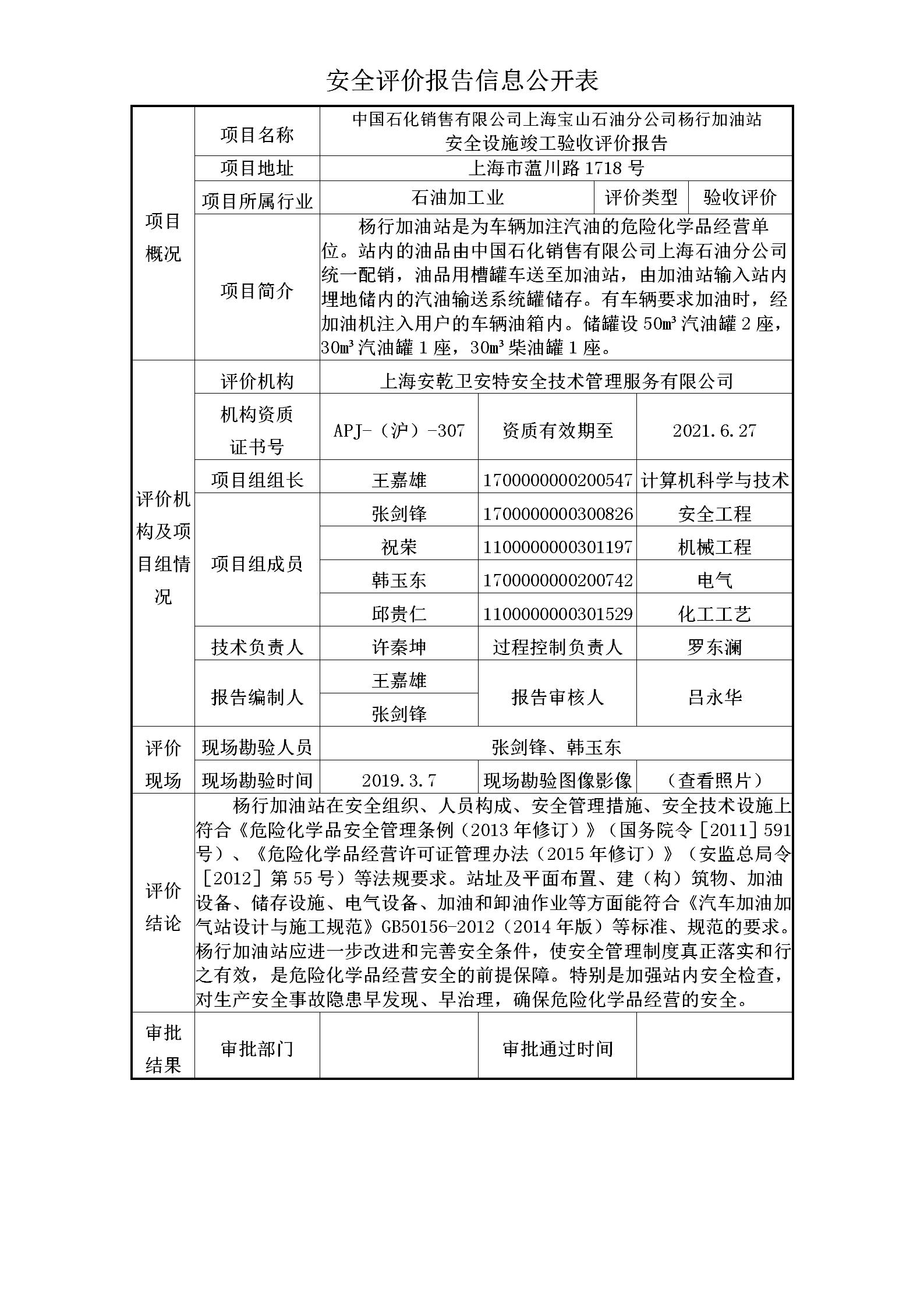 中国石化销售有限公司上海宝山石油分公司杨行加油站安全设施竣工验收评价报告