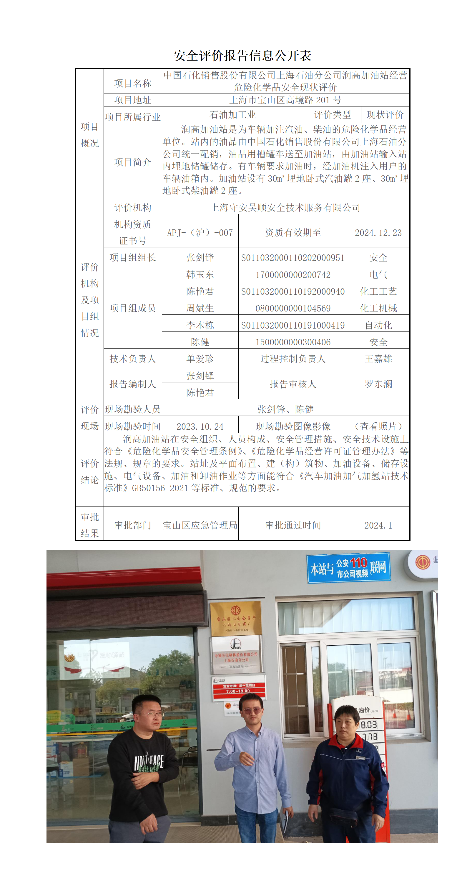 中国石化销售股份有限公司上海石油分公司润高加油站经营危险化学品安全现状评价