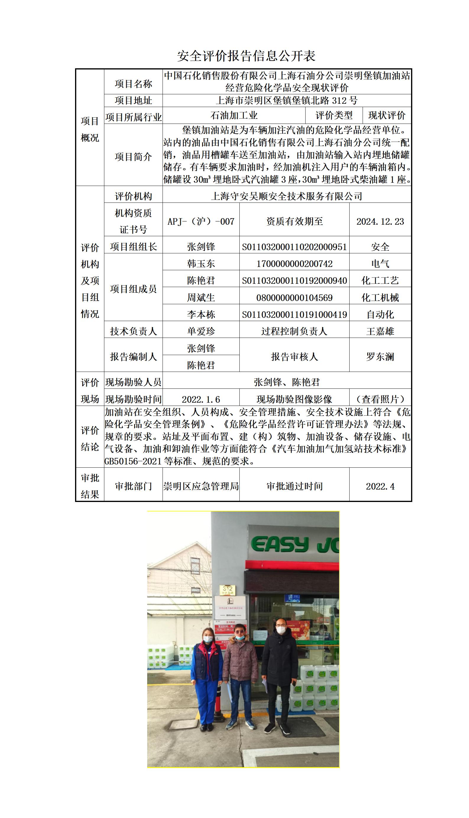 中国石化销售股份有限公司上海石油分公司崇明堡镇加油站经营危险化学品安全现状评价