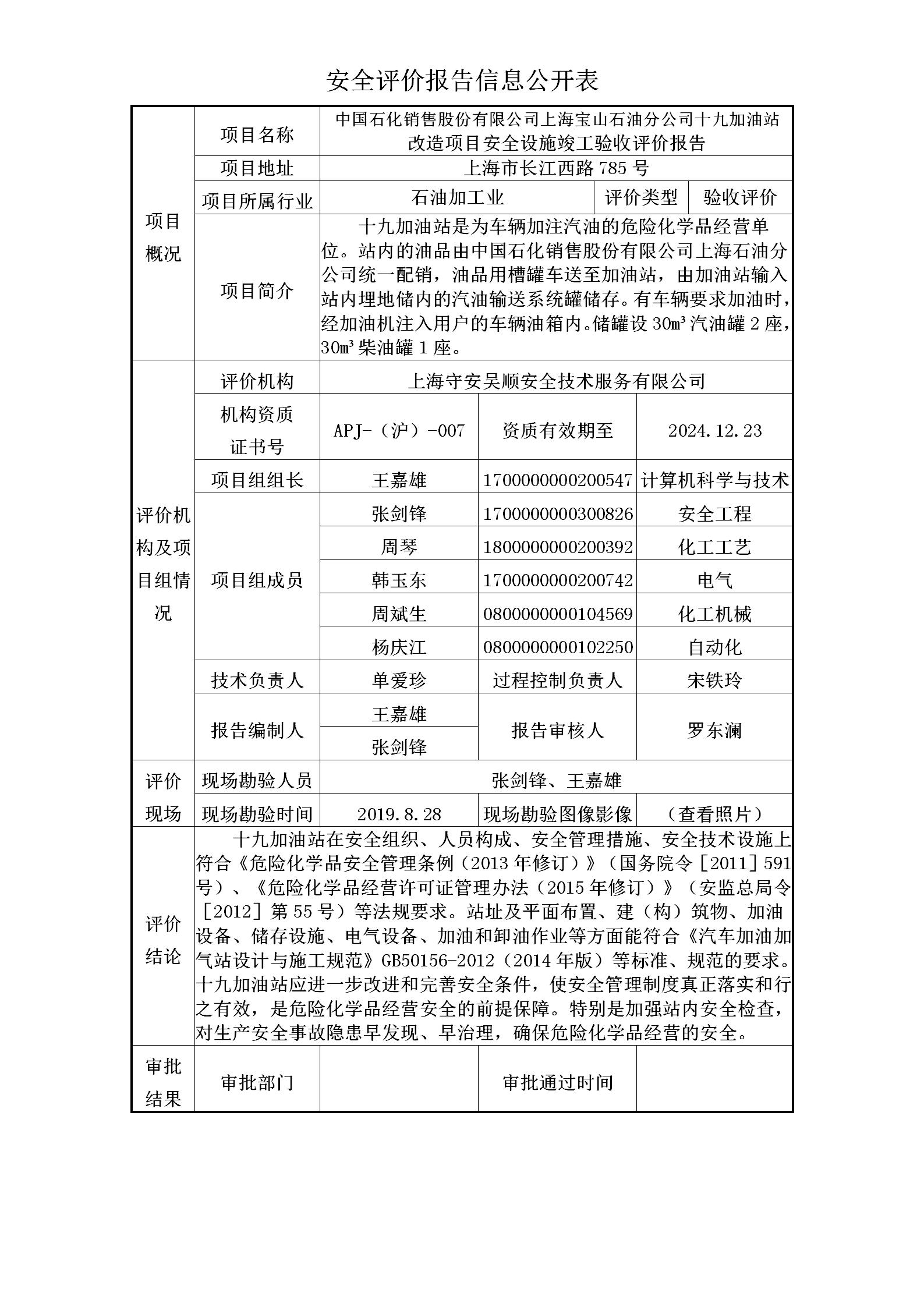 中国石化销售股份有限公司上海宝山石油分公司十九加油站 改造项目安全设施竣工验收评价报告