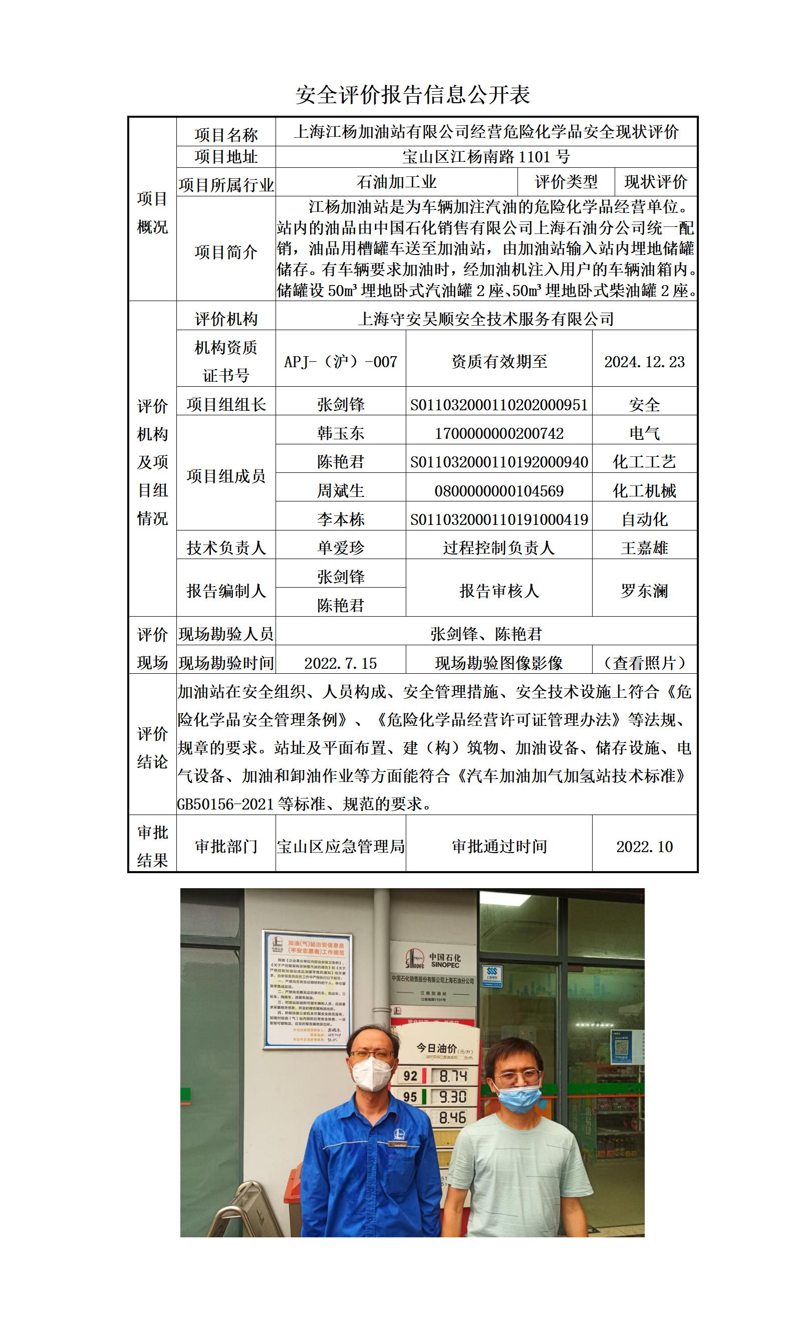 上海江杨加油站有限公司经营危险化学品安全现状评价