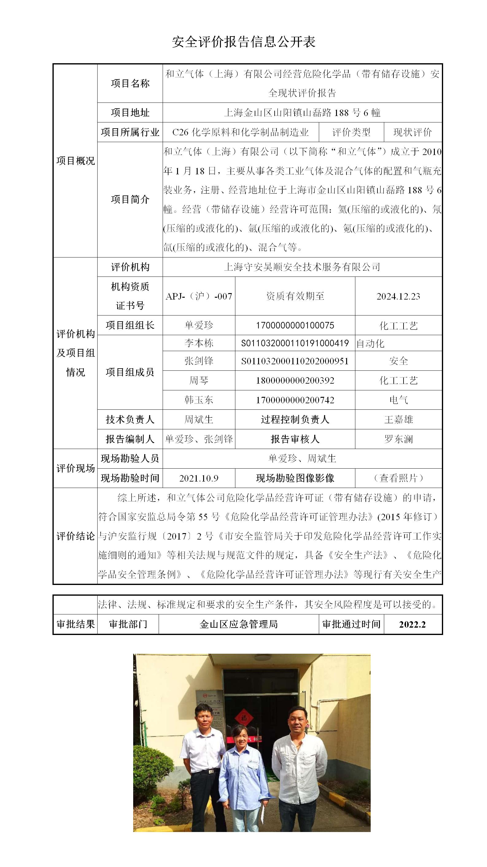 和立气体(上海)有限公司经营危险化学品(带有储存设施)安全现状评价