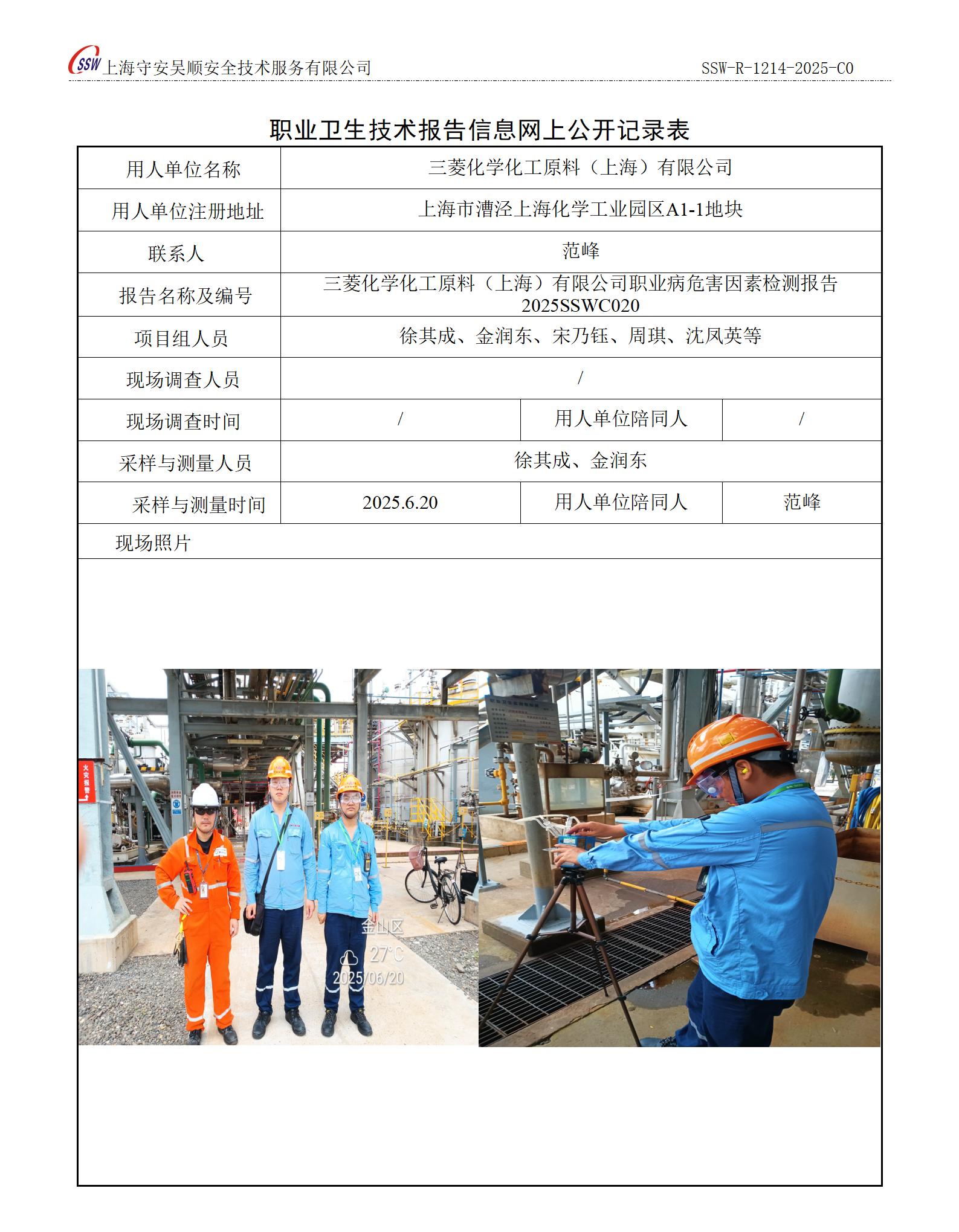 三菱化学化工原料(上海)有限公司职业病危害因素指定检测