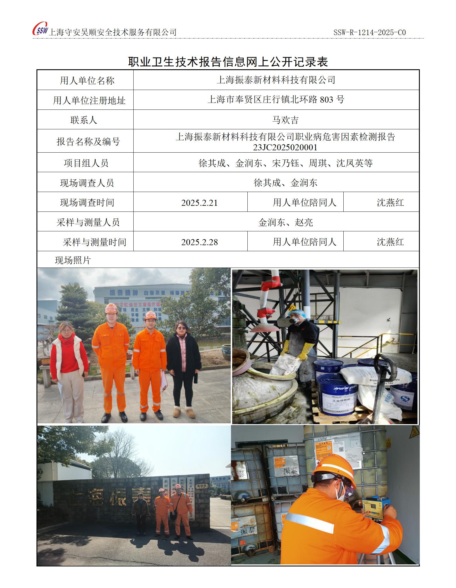 上海振泰新材料科技有限公司职业病危害因素定期检测