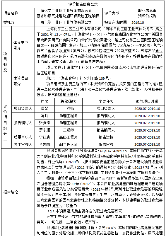 上海化学工业区工业气体有限公司废水和废气处理设施环保改造工程项目职业病危害预评价报告