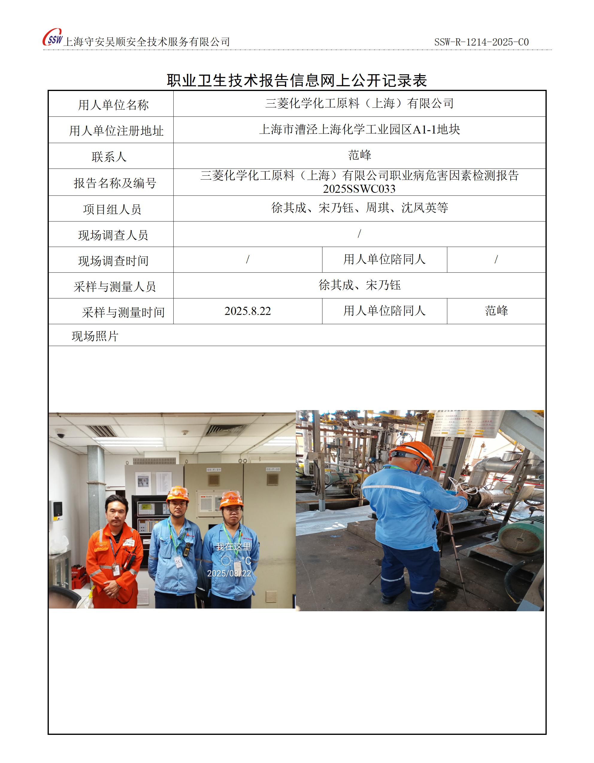 三菱化学化工原料(上海)有限公司职业病危害因素指定检测