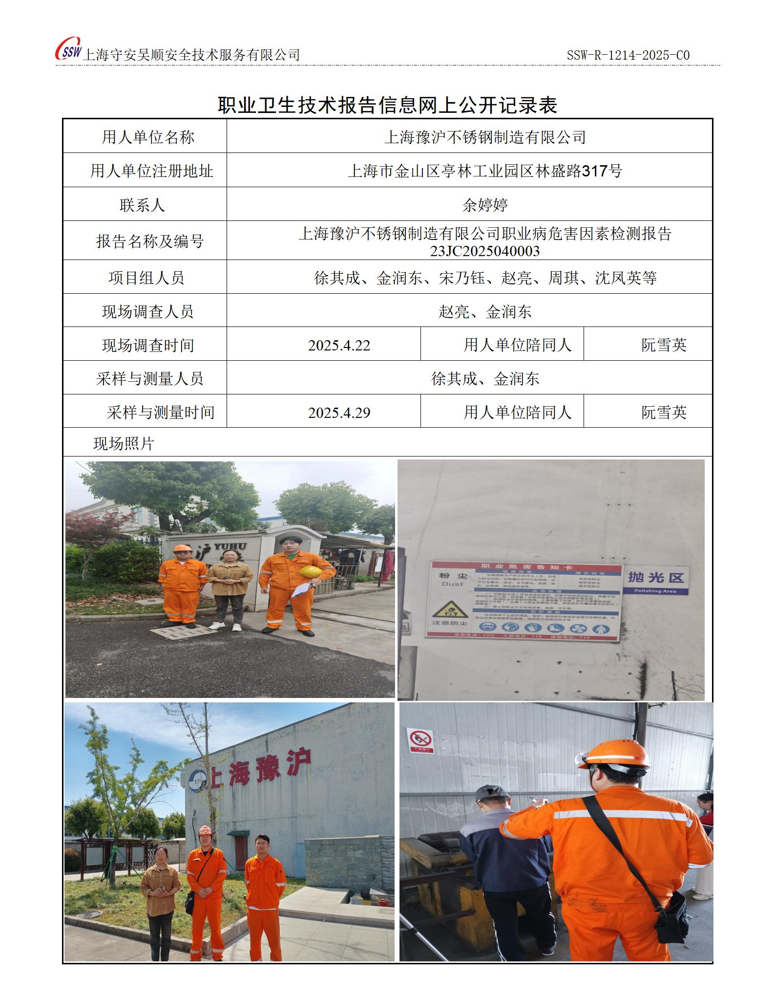 上海豫沪不锈钢制造有限公司职业病危害因素定期检测