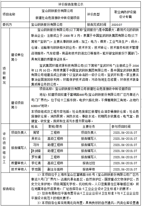 宝山钢铁股份有限公司 新建社会危废接收中转设施项目职业病防护设施设计专篇
