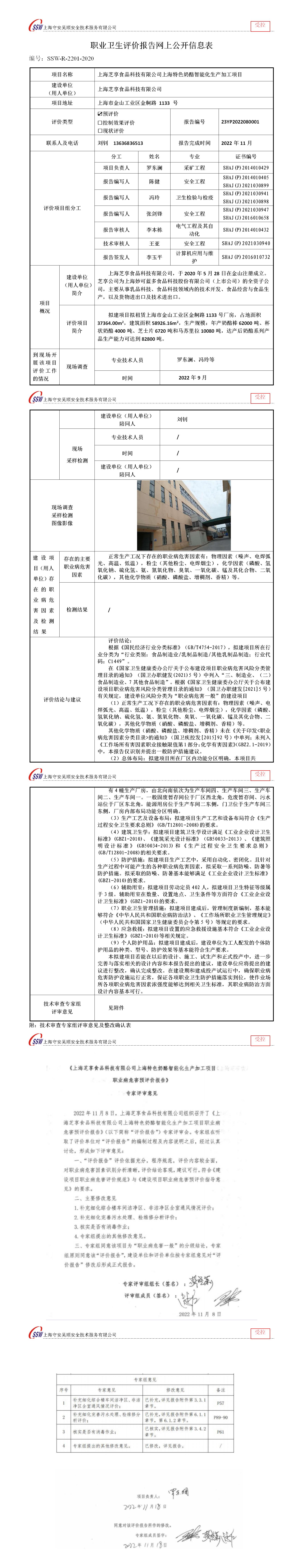 上海芝享食品科技有限公司上海特色奶酪智能化生产加工项目职卫预评价
