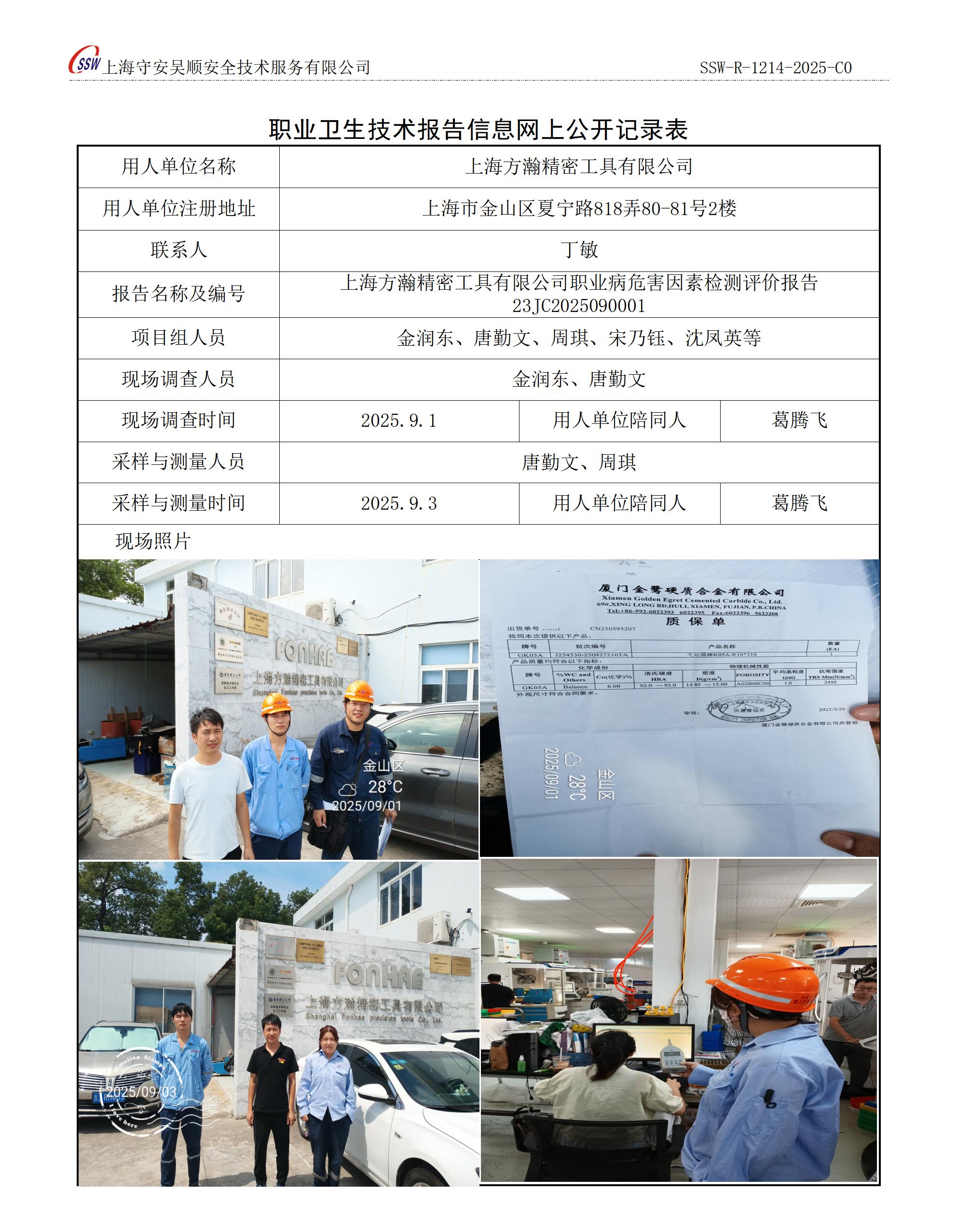 上海方瀚精密工具有限公司职业病危害因素定期检测