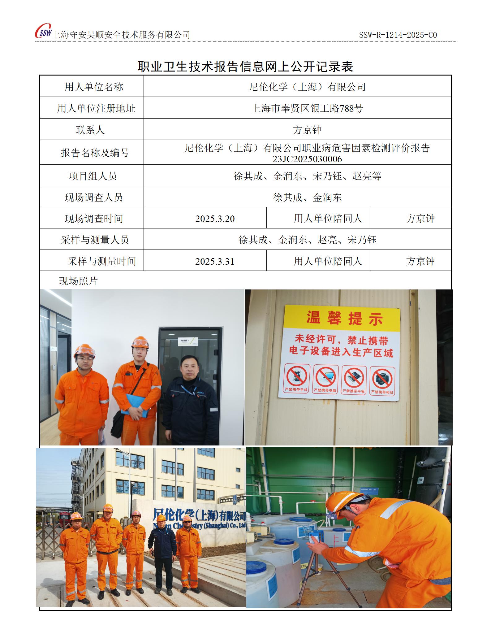尼伦化学(上海)有限公司职业病危害因素定期检测