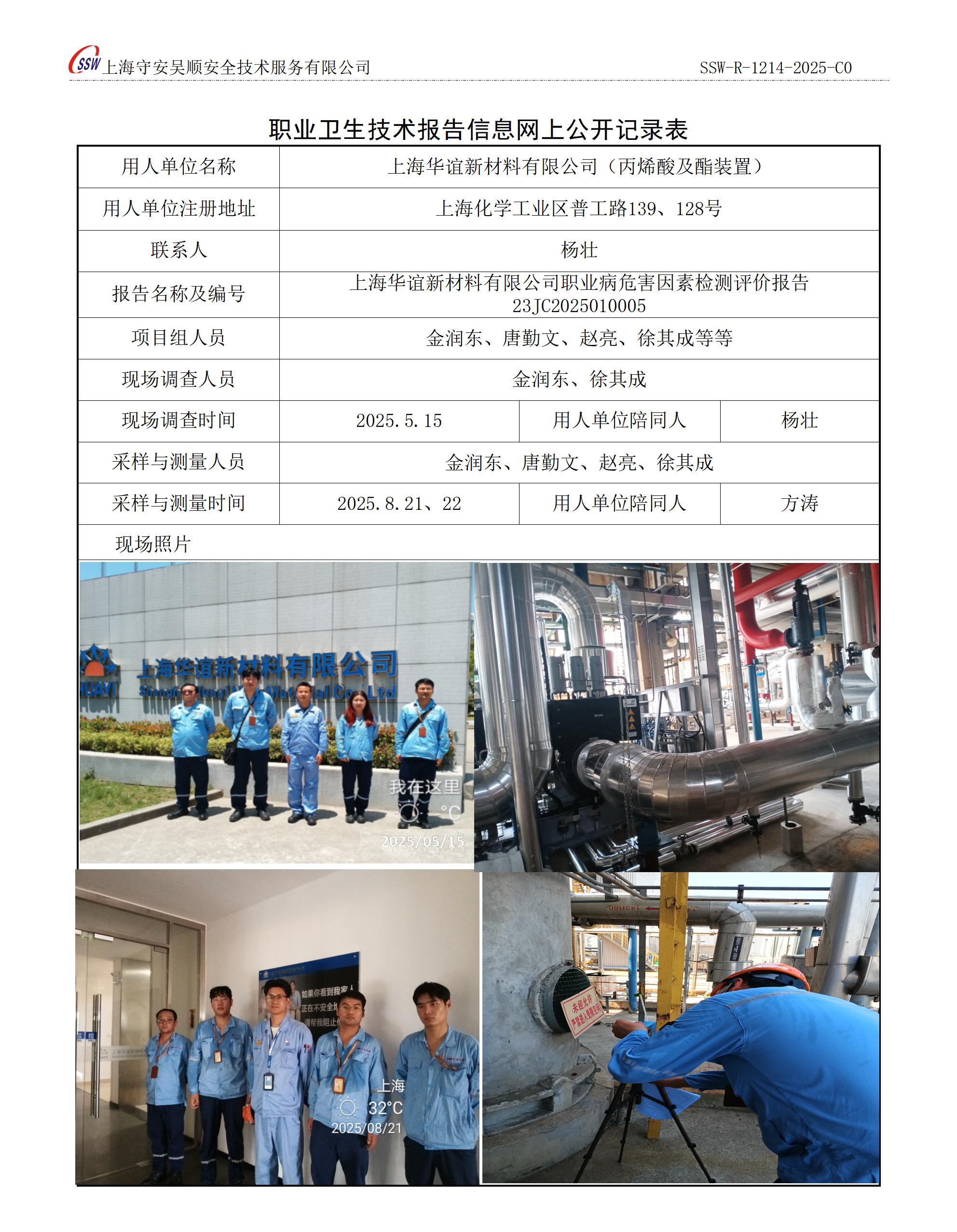 上海华谊新材料有限公司(丙烯酸及酯装置)职业病危害因素定期检测