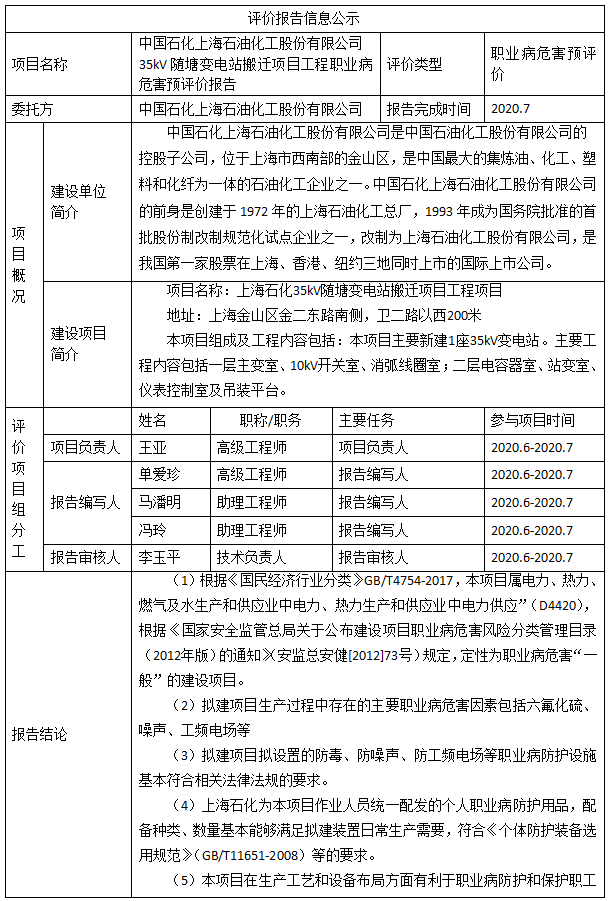 中国石化上海石油化工股份有限公司 35kV随塘变电站搬迁项目工程职业病危害预评价报告