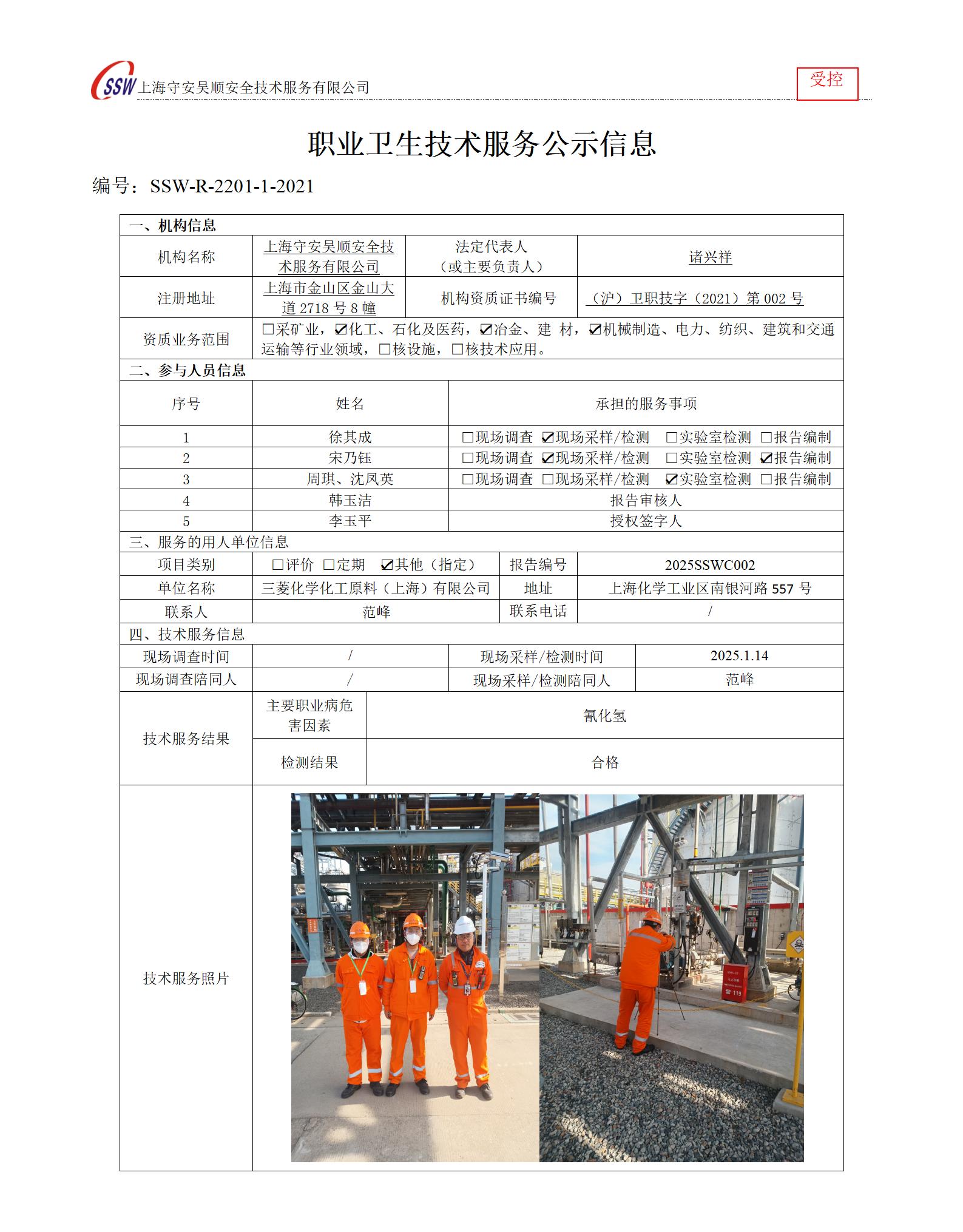 三菱化学化工原料(上海)有限公司月度检测